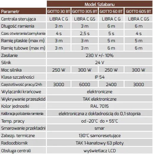 Posiadają silnik zasilany napięciem 24 V. Szlabany w wersjach 30 BT/60 BT posiadają centralę sterującą LIBRA C G, natomiast w wersji 30 S BT/60 S BT centralę LIBRA C GS. Wszytskie jednostki wyposażone są w funkcję zwolnienia przy otwieraniu i zamykaniu.